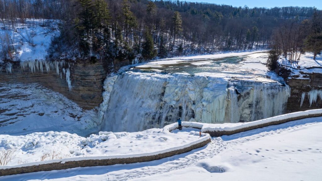 Often called the “Grand Canyon of the East,” Letchworth gets a magical layer of snow in winter. Trails remain open for hiking and cross-country skiing, and the waterfalls look even better when they’re iced over.