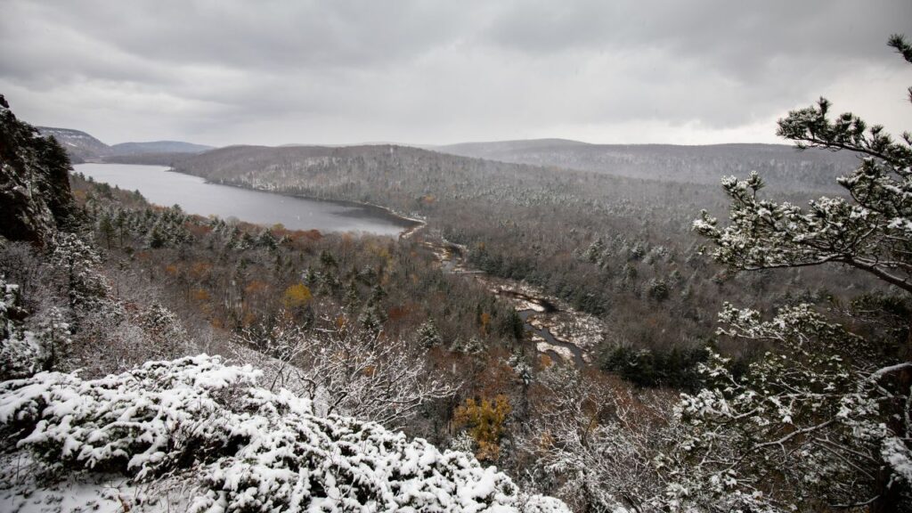 Tucked in Michigan’s Upper Peninsula, this park becomes a snow-covered wilderness once winter hits. Trails are open for snowshoeing and backcountry campsites stay available year-round.