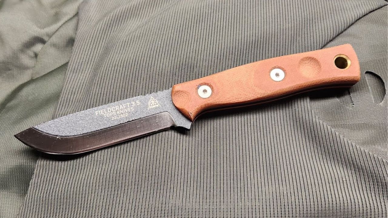 The Fieldcraft 3.5 is a nice answer for someone who likes the Fieldcraft idea but wants less knife hanging off them all day. TOPS lists it at 5.5 ounces, with tan canvas Micarta scales and a black Kydex sheath with rotating spring-steel clip. Compared to the full-size version, that tighter overall package makes it easier to carry around other gear without the knife becoming one more thing you constantly have to manage.