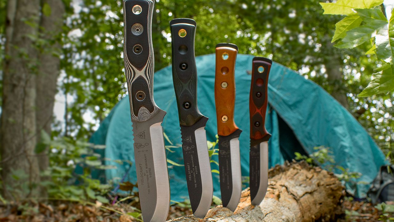 The full-size Fieldcraft is more woods knife than pure hunting knife, but it still belongs in this conversation because the carry setup is more controlled than a lot of knives its size. TOPS lists it with a Kydex sheath and rotating spring-steel clip, plus canvas Micarta handle scales. That matters because Micarta usually gives you a stable grip without the plasticky bite some rougher synthetic textures can have, and a Kydex sheath with a decent clip can ride much tighter than floppy nylon.