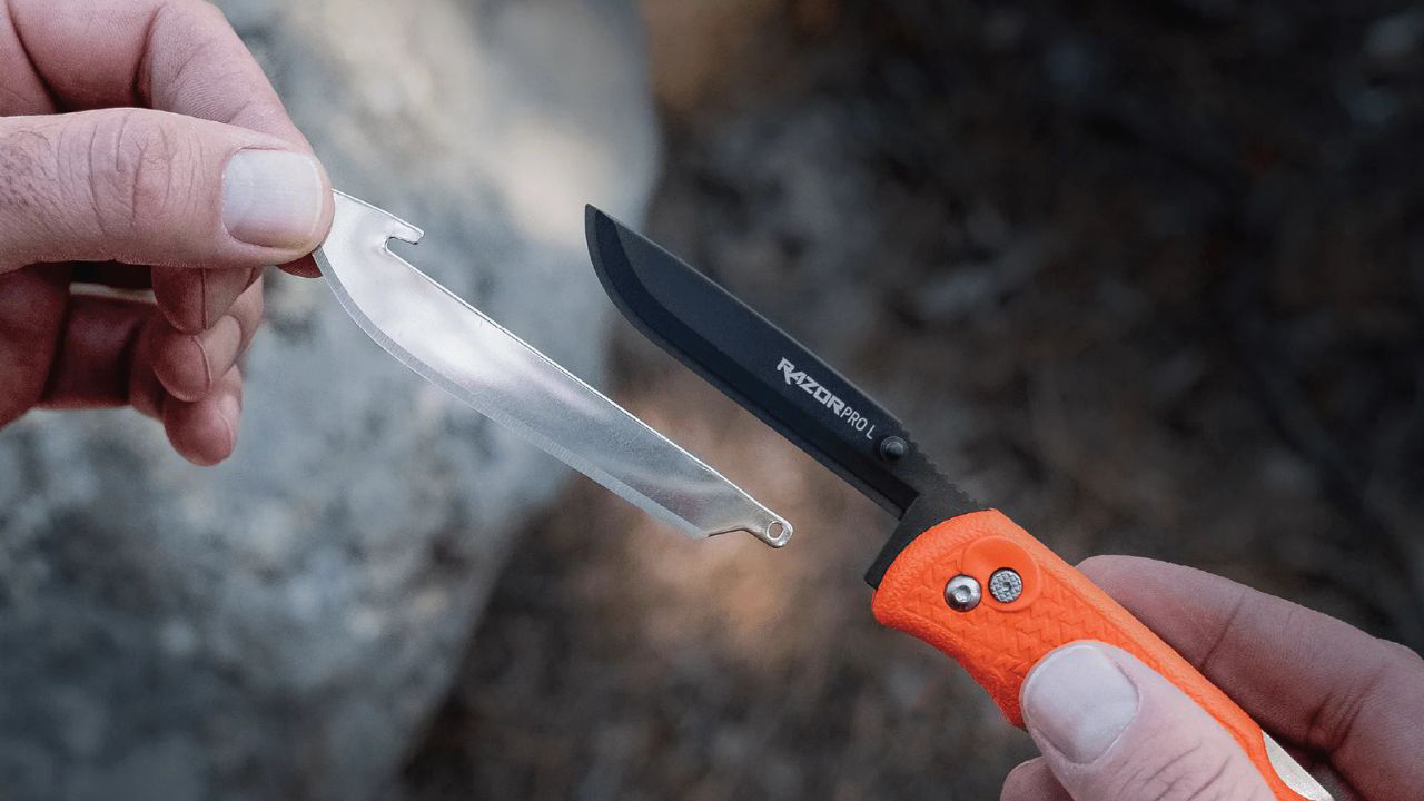 The RazorLite earns a spot here because Outdoor Edge clearly built it for hunters who care about grip and field practicality more than image. The company describes it with an ergonomic non-slip TPR handle and a durable nylon belt sheath with blade storage. It also notes that the handle is meant to stay secure even when wet, which matters a lot during actual game processing.