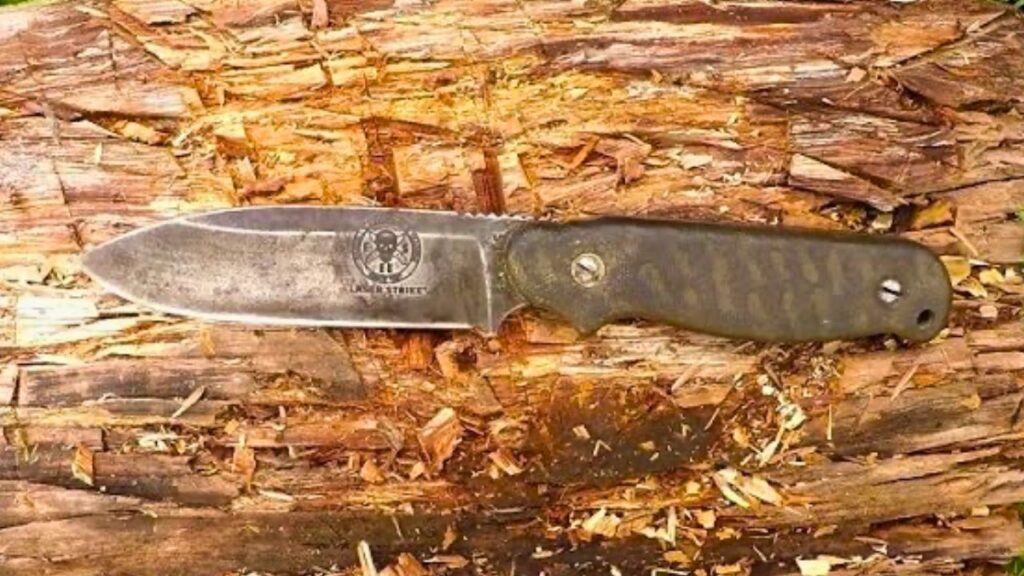 The ESEE Laser Strike is built with 1095 carbon steel, which sharpens easily but also holds a working edge well through hardwood and camp chores. It’s a solid choice for backwoods tasks where you’ll be hitting wood, bone, and everything in between. Plus, it carries a small ferro rod inside the handle for extra camp utility.