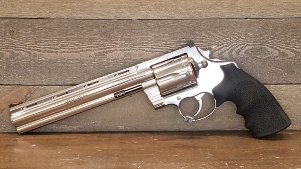 Introduced in 1990, the Colt Anaconda targeted big-bore revolver enthusiasts who needed stopping power for hunting and protection against large game. Chambered in .44 Magnum, its sturdy stainless-steel frame and smooth action made it an instant competitor to Smith & Wesson’s Model 29.
