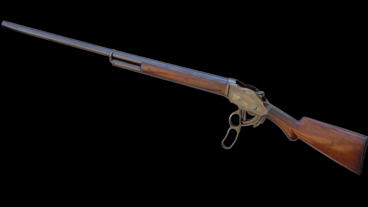 The Winchester 1887 lever-action shotgun looks aggressive because it’s unusual. A lever shotgun already feels like it shouldn’t exist, and that’s exactly why it pops on a wall. The big loop, the long receiver, and the thick barrel give it a heavy, confrontational profile.