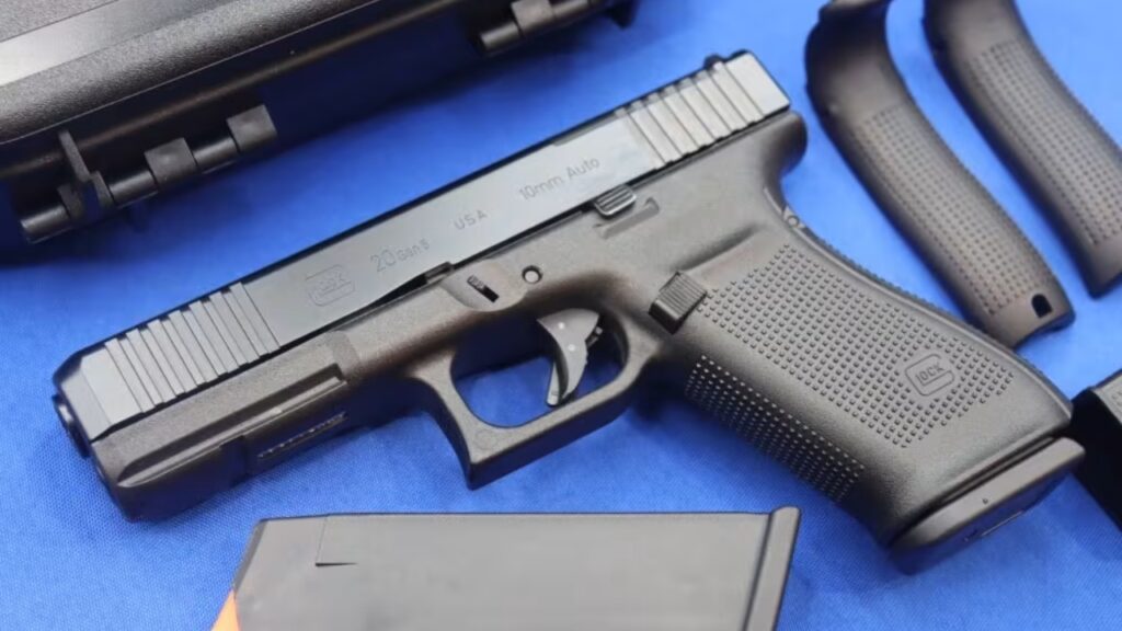 The Glock 20’s grip is a handful in every sense. That double-stack 10mm magazine forces the frame into square, chunky territory. It’s wide, flat, and feels like wrapping your hand around a deck of playing cards.