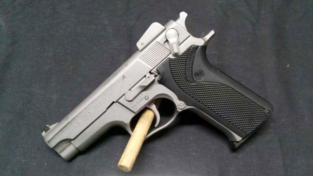 The Smith & Wesson 5906 is an all-stainless 9mm pistol from the company’s third-generation line. Its steel frame gives it heft, which makes recoil more manageable during long range sessions. The double-stack magazine adds capacity, while the DA/SA trigger system makes it versatile for defensive use.
